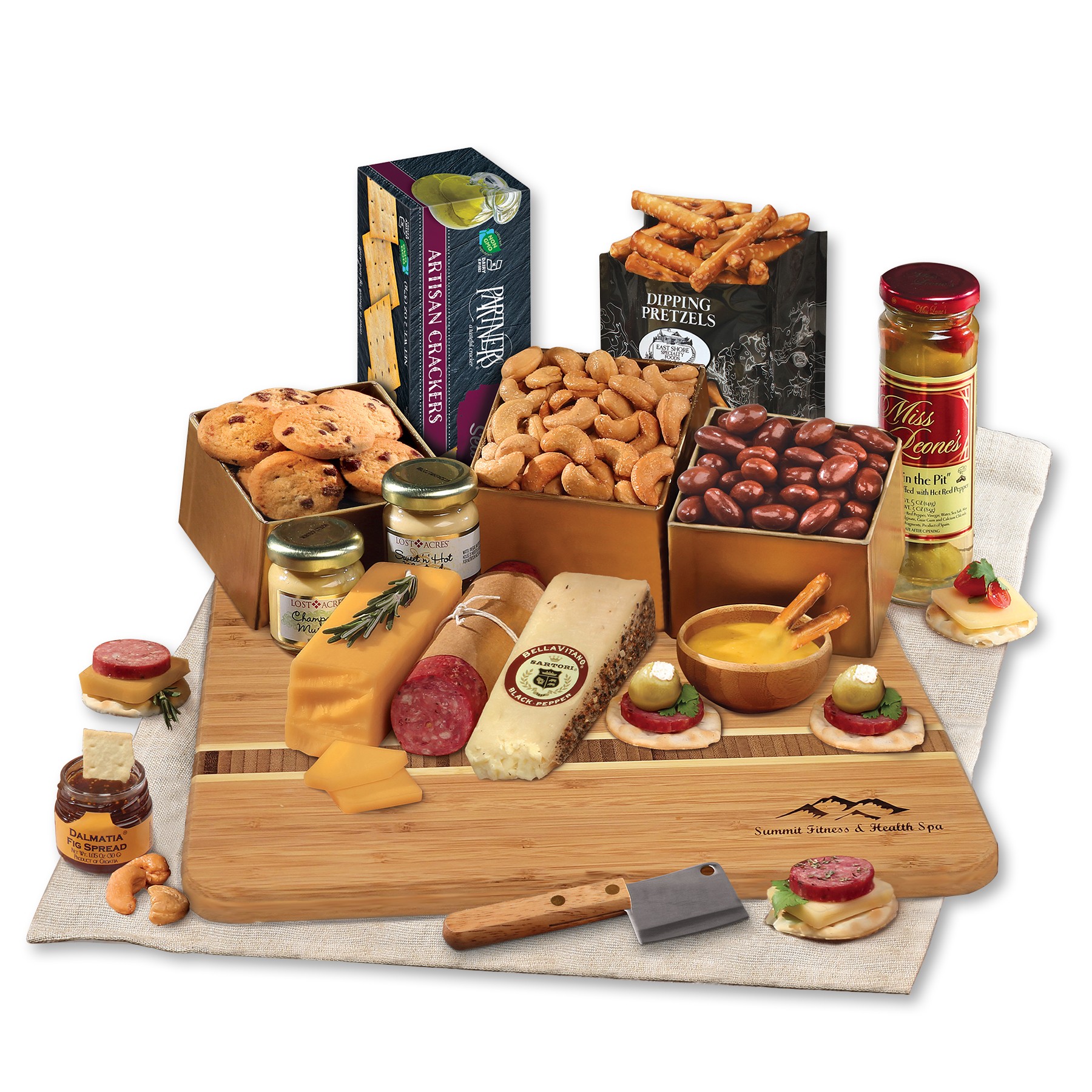 This oversized, sustainable bamboo board features a sleek contrasting stripe and comes loaded with an amazing array of gourmet delights, including award-winning Wisconsin cheese. We round out the flavor profile with superb selections, including sausage, spreads, and our world-famous chocolate covered almonds, then finish it off with crackers and a cleaver for serving. The board is the perfect base for charcuterie assortments, ensuring they’ll remember your generosity long after everything has been enjoyed. Complies with CPSIA, FDA, Prop 65. 12.5″ L x 8″ W x 0.75″ H