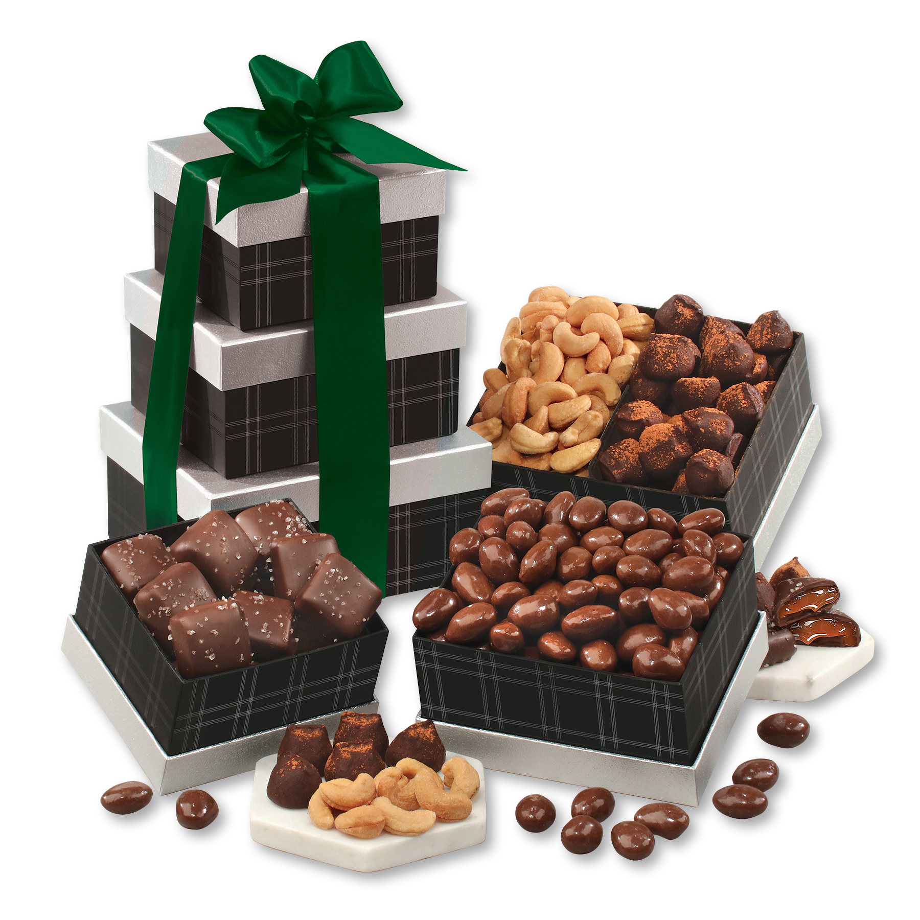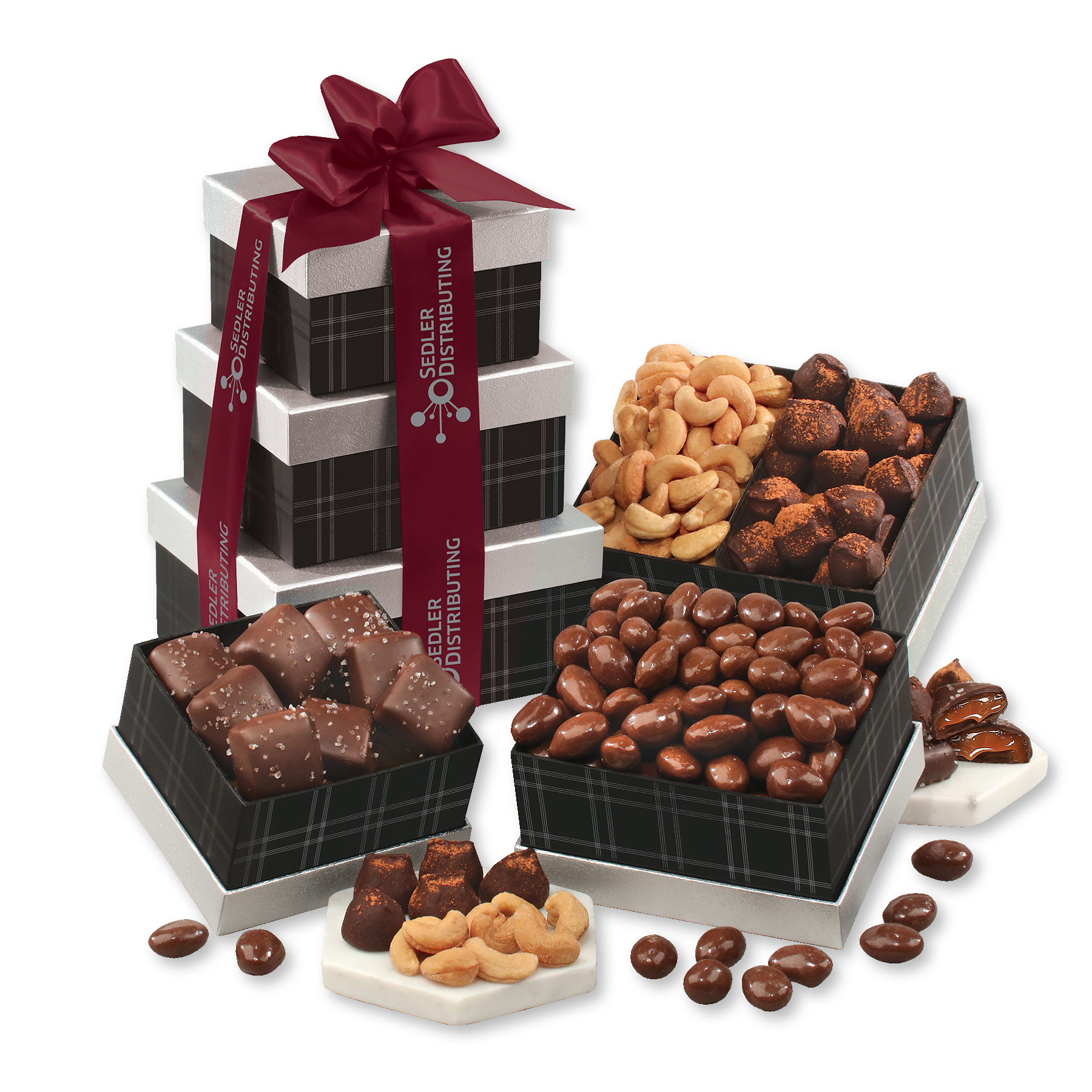 Tucked inside these black tonal plaid boxes is a selection of favorites sure to satisfy! Milk and dark chocolates pair beautifully with fresh-roasted cashews for an experience your recipients won’t soon forget. We tie this tower of deliciousness with your choice of ribbon foil-stamped with your logo in silver. They’re sure to know how much you appreciate them with this distinctive gift. Complies with CPSIA, FDA, Prop 65. 6″ L x 5″ W x 8.5″ H