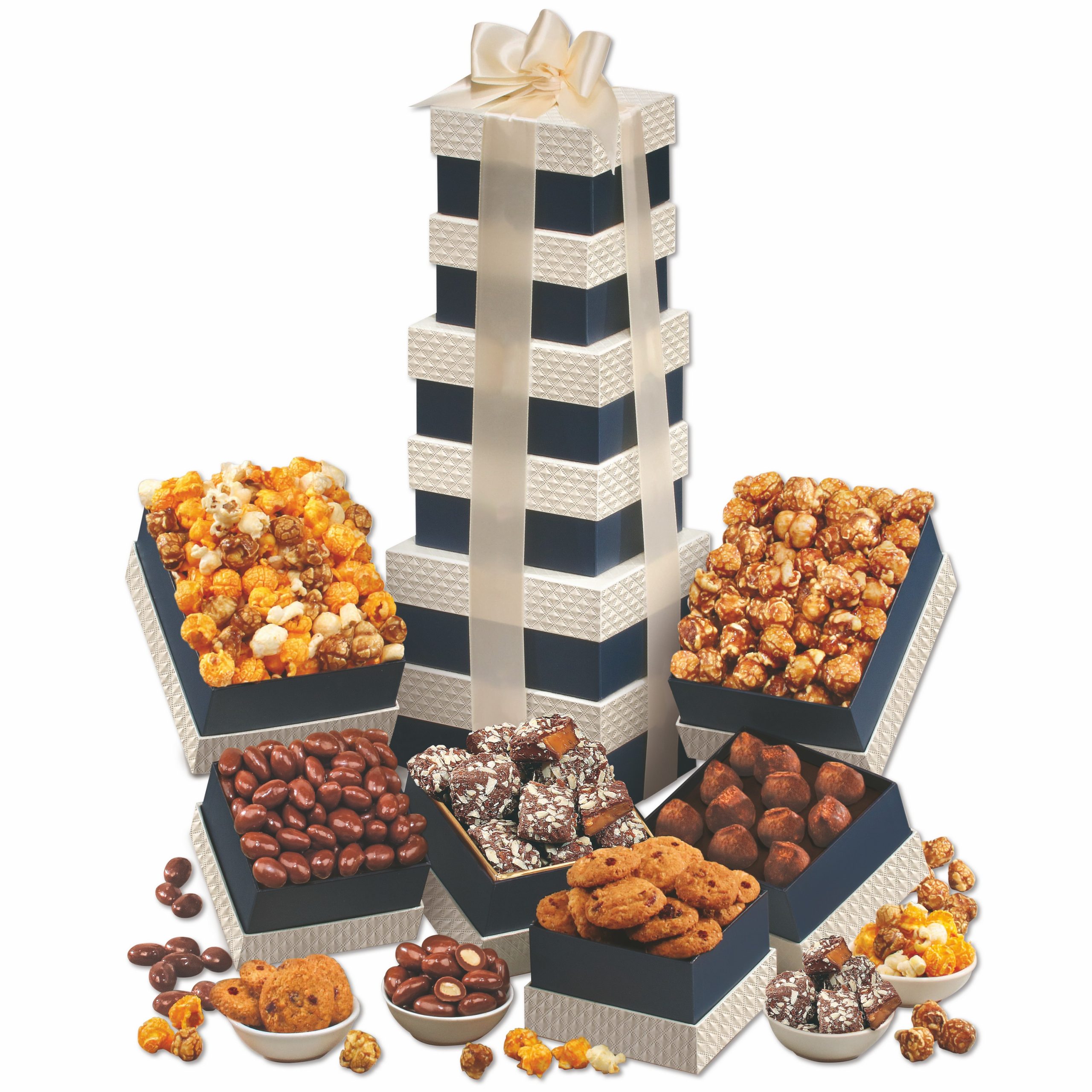 This is a gift for any occasion that could use a little elegance! Half a dozen delectable treats, including chocolates, caramel corn, and cookies, are packed lovingly in elegant navy and pearl boxes. The boxes are stacked high and tied with ivory ribbon bearing your imprint foil-stamped in your choice of color. Every recipient is sure to remember this great gift for years to come. Complies with CPSIA, FDA, Prop 65. 6.5″ L x 5.75″ W x 15.75″ H