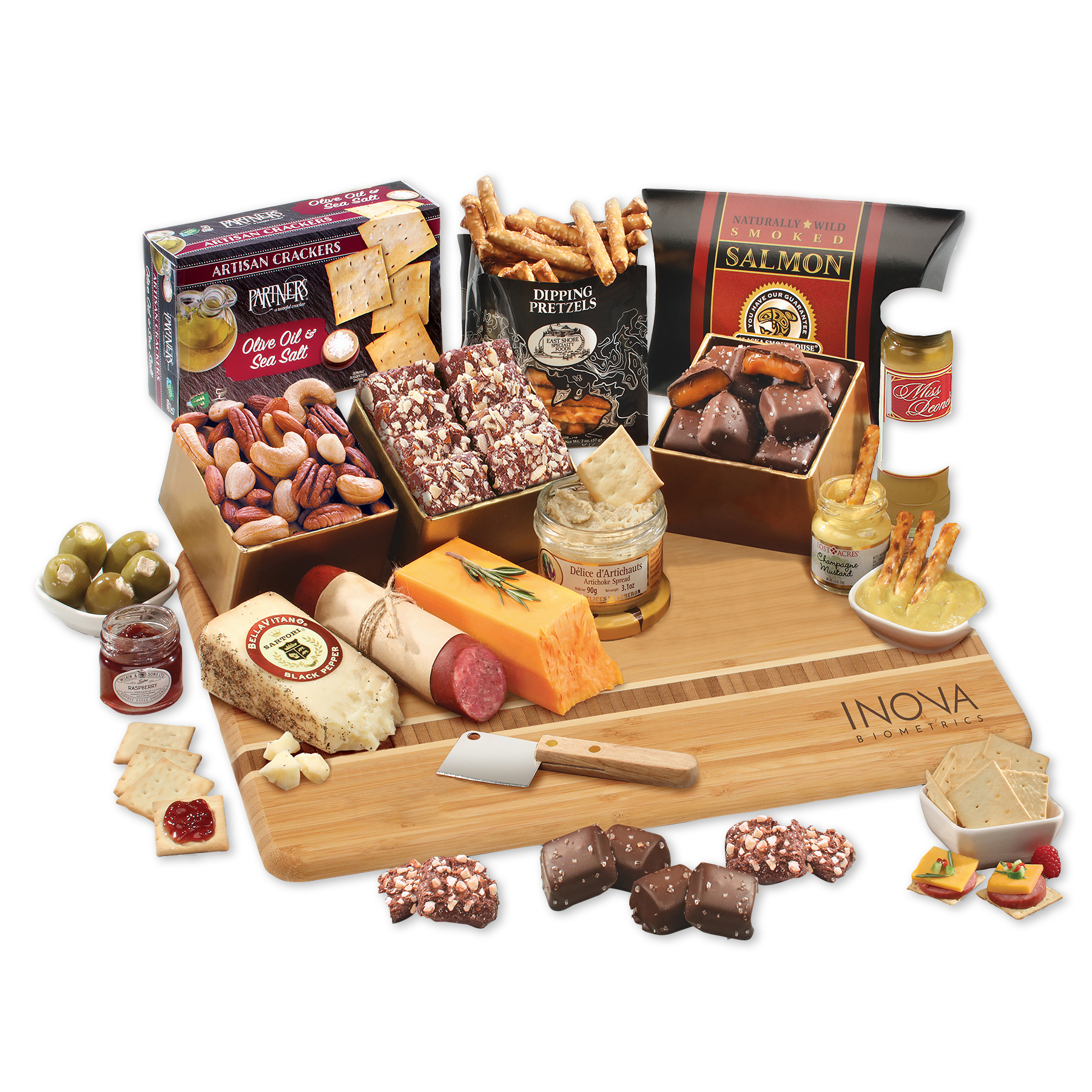 When you can’t decide what to give, give some of everything! We include smooth chocolates, sweet and crunchy nuts, gourmet Wisconsin cheese and sausage, and much more. This amazing feast comes packaged with an oversized, sustainable bamboo board (15″ x 11″), stylishly firebranded with your logo. It’s an experience that every recipient is guaranteed to remember. Serves 14-20. Complies with CPSIA, FDA, Prop 65. 15″ L x 11″ W x 0.75″ H