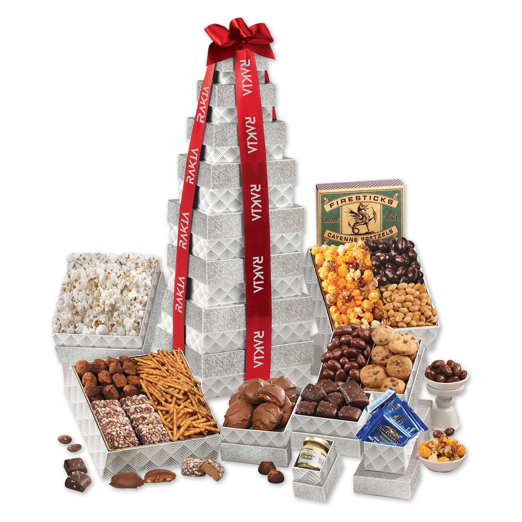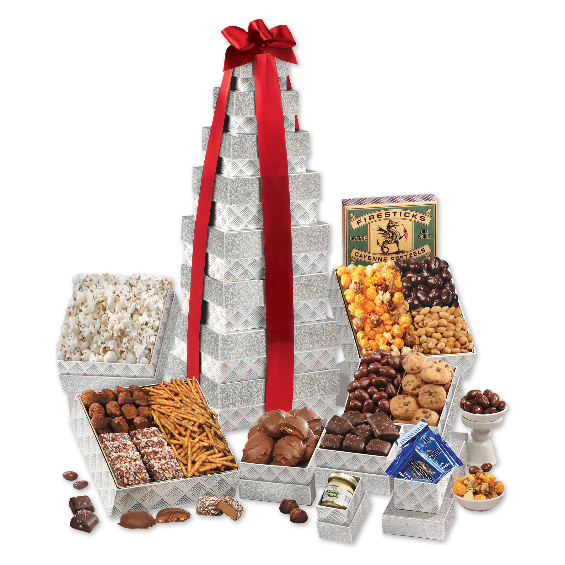 Transport them back to simpler times with this towering assortment. The broad variety of flavors means there’s something for everyone, including popcorns, nuts, pretzels, and—of course—sweets. They’ll delight in selecting from the options and enjoying every one. For the final touch, we tie the classic boxes together with your choice of ribbon featuring your logo foil-stamped in silver. They’re sure to always remember this stunning gift! Complies with CPSIA, FDA, Prop 65. 8.125″ L x 7.25″ W x 23.625″ H