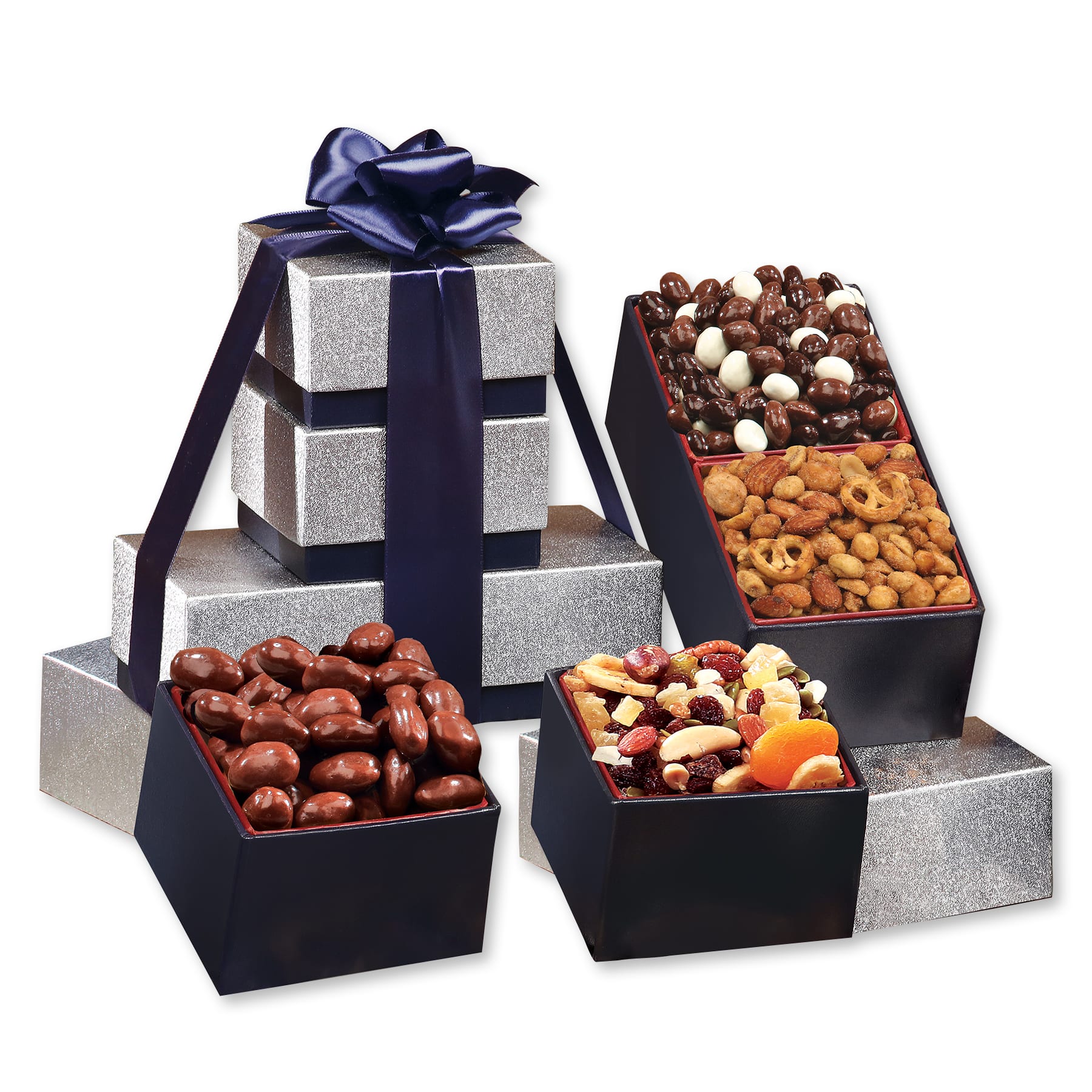 Give a gift that speaks volumes for your appreciation! Stylish silver and navy boxes are overflowing with four gourmet kosher treats: sweet and salty Western Trail Mix, classic Milk Chocolate Almonds, smooth Chocolate Covered Raisins, and flavorful Sweet & Salty Mix. Navy ribbon foil-stamped in silver with your logo or imprint ties it all together. Show them how much you care with this exceptional gift. Serves 8-12. 7.375″ L x 3.875″ W x 6.75″ H