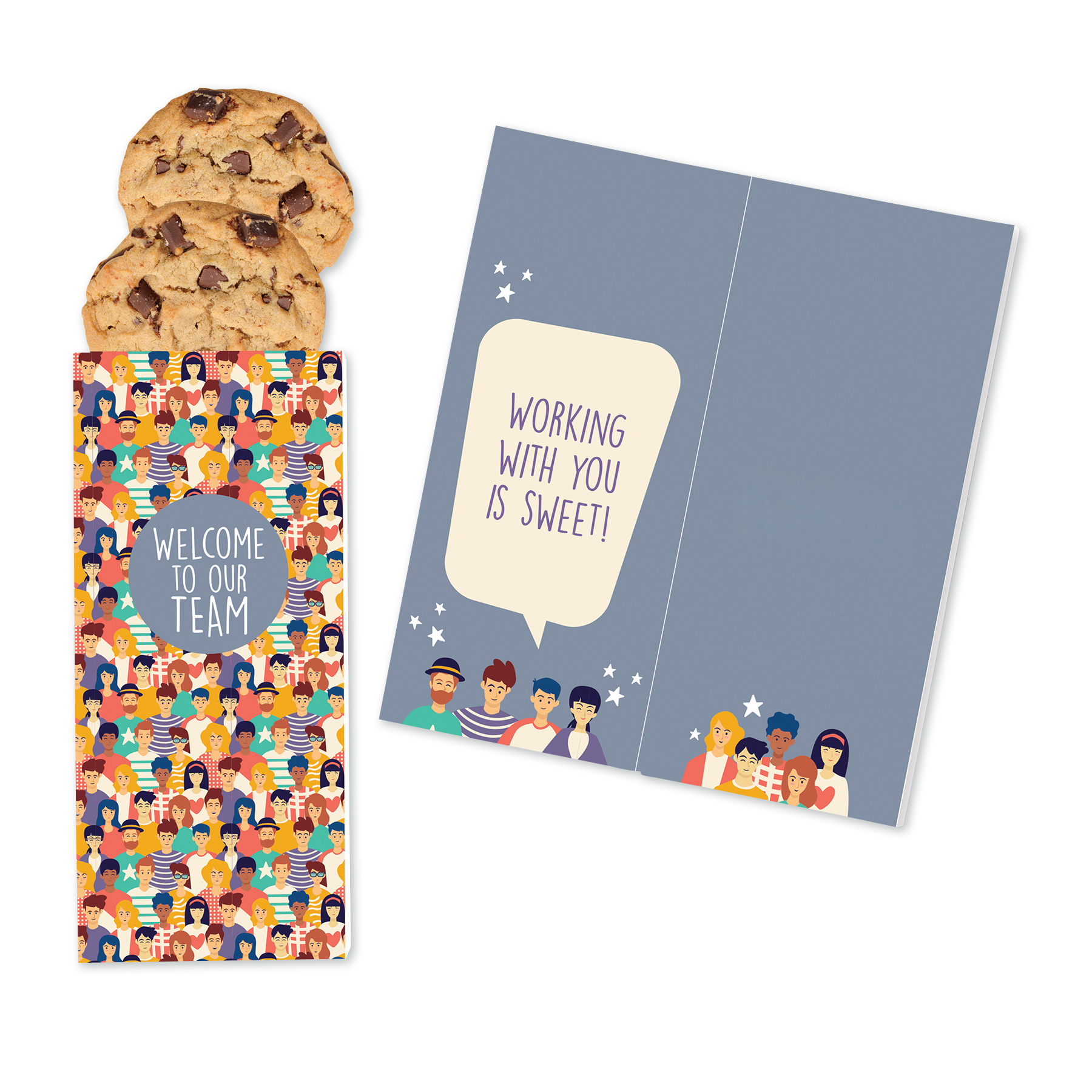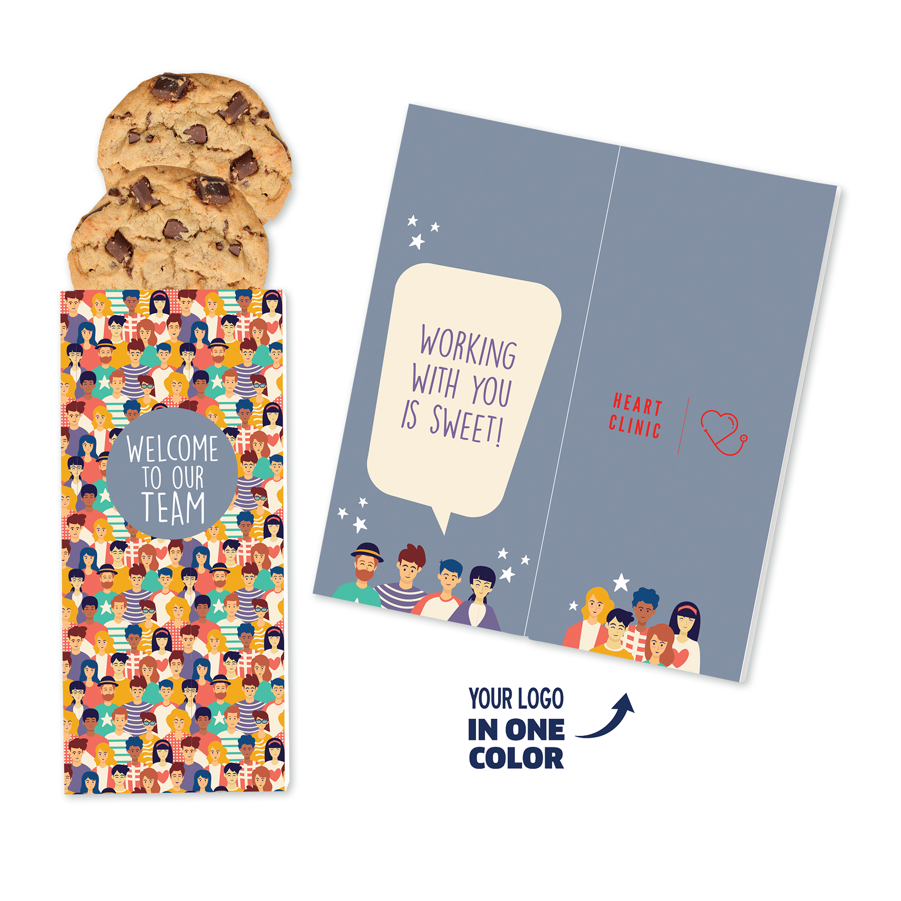 A Sweeter Card is a greeting card and gourmet treat in one. This gift features your logo foil-stamped in one color of your choice on the inside. The pre-designed card features a welcoming message and comes packed with two chewy chocolate chip cookies. Choose the imprint color from the choices below and send us your logo. Complies with CPSIA, FDA, Prop 65. 7.75″ L x 3.5″ W x 0.5″ H