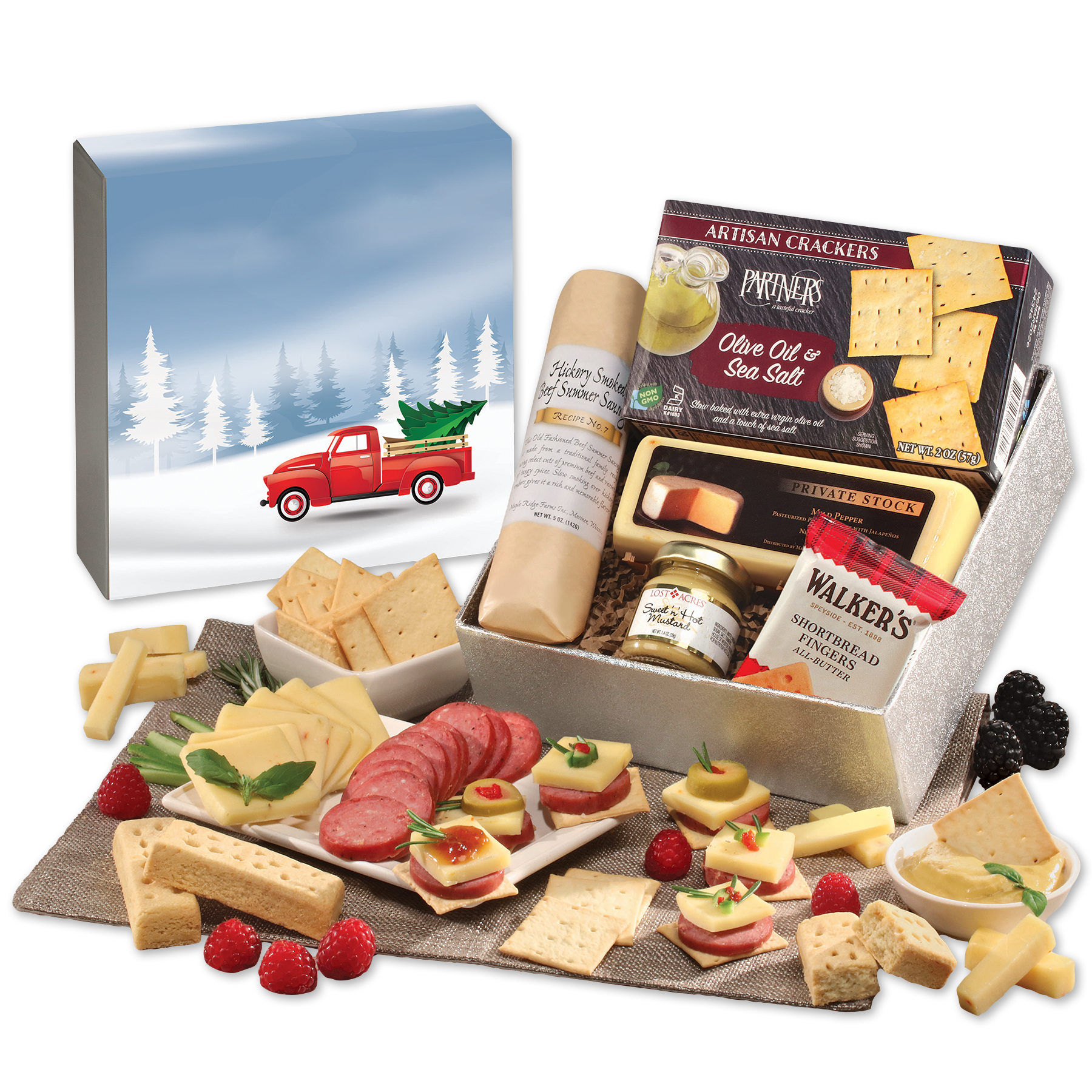 This lovely gift box has everything you need to start the perfect holiday party! Filled with shelf-stable cheese, sausage, and other delectable delights, it’s a flavor bonanza sure to be remembered. Each box features a sleeve decorated with a classic red truck, foil-stamped with your imprint in your choice of color. Make a statement they’ll truly appreciate with this amazing gift! Complies with CPSIA, FDA, Prop 65. 7.375″ L x 7.375″ W x 2.25″ H