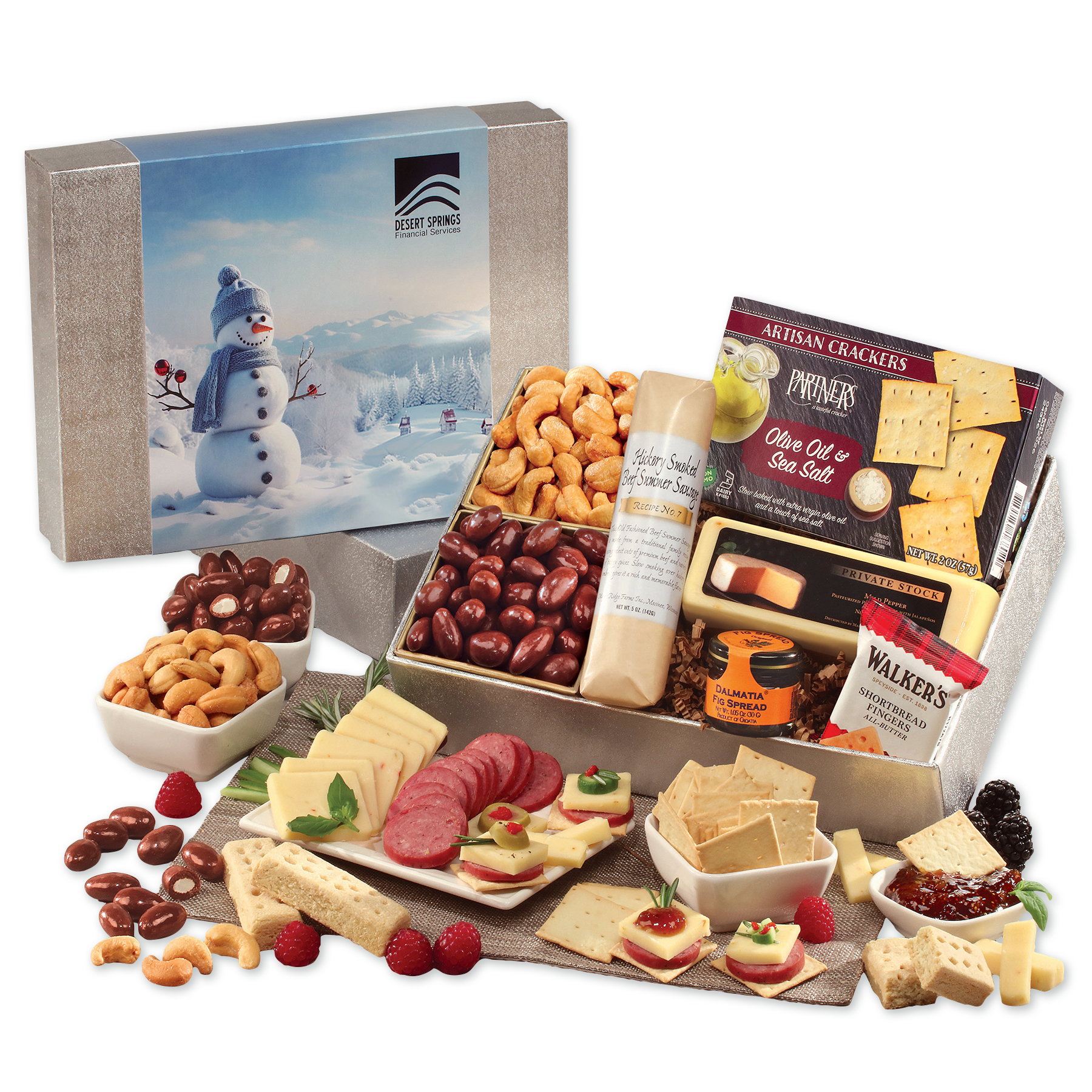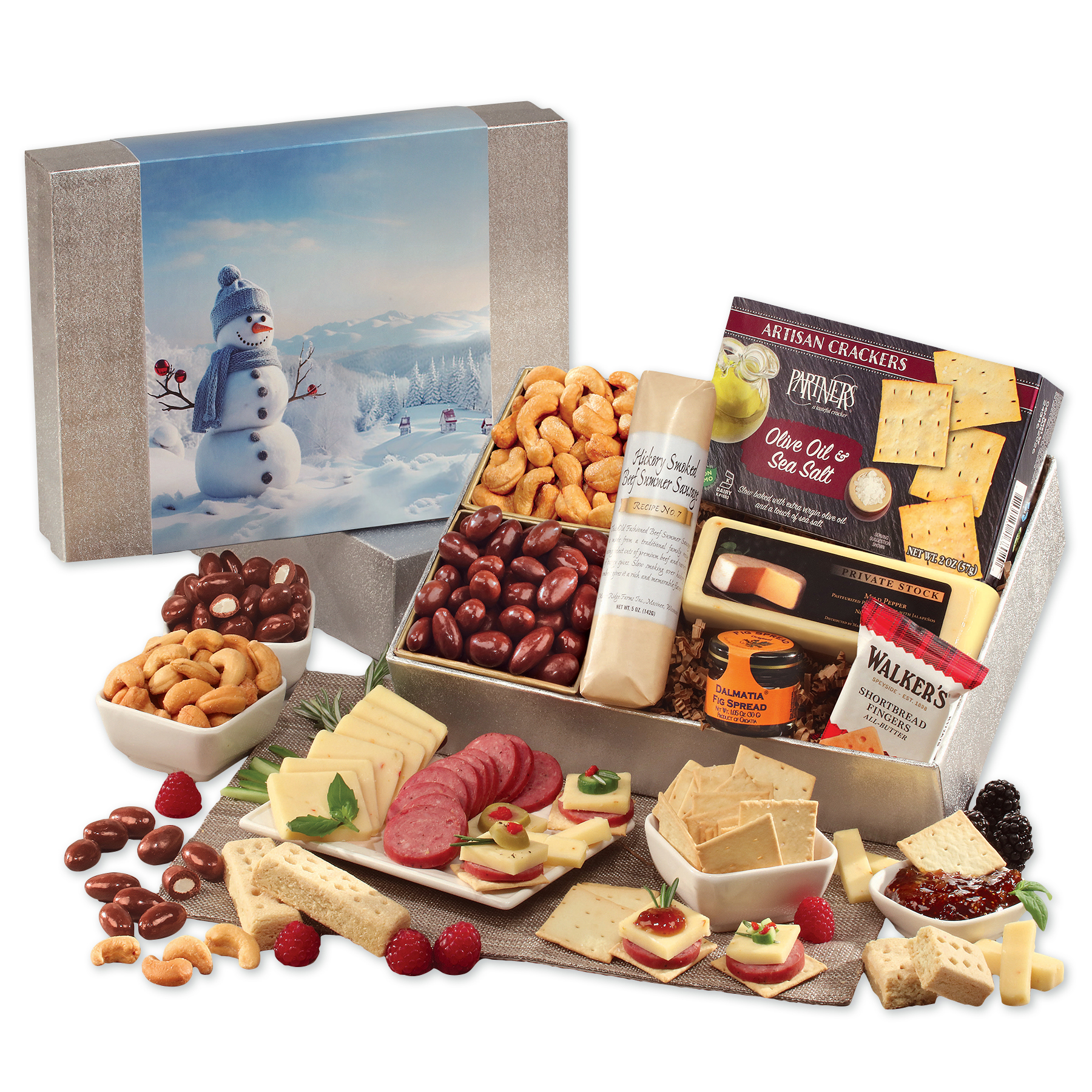 This lovely gift box has everything you need to start the perfect holiday party! Filled with shelf-stable cheese, sausage, and other sumptuous treats, it’s a flavor bonanza sure to be remembered. Each box features a sleeve decorated with a nostalgic snowman scene, foil-stamped with your imprint in your choice of color. Make a statement they’ll truly appreciate with this amazing gift! Complies with CPSIA, FDA, Prop 65. 10.625″ L x 7.125″ W x 2.125″ H