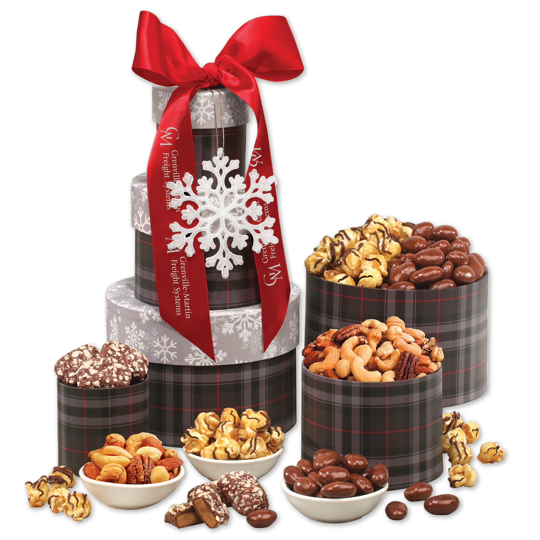Receiving this charming tower is the best kind of surprise! Three round boxes come filled with sweet and salty treats sure to delight every recipient. Featuring black plaid bases and snowflake-adorned lids, this gift comes stacked in a clear bag tied with your choice of ribbon foil-stamped in silver. For the perfect final touch, a festive snowflake ornament hangs from the bow to tease and delight every recipient. They’re sure to remember this sweet surprise! Complies with CPSIA, FDA, Prop 65. 5.75″ L x 4″ W x 11″ H