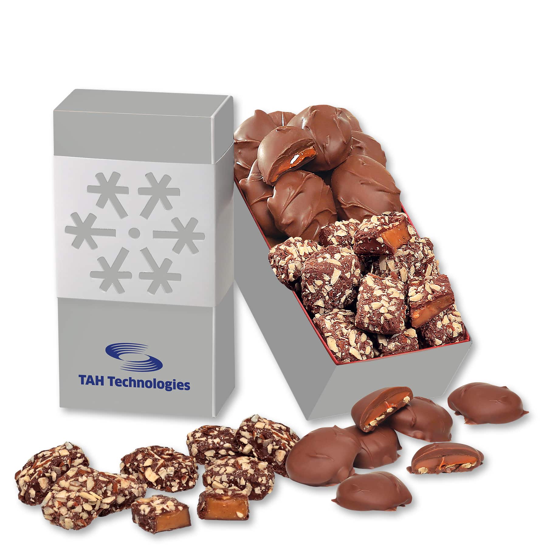 Your customers and employees will be thrilled with this delicious gift! Rich, mouthwatering Caramel Pecan Clusters made with creamy caramel, full-flavored Southern pecans, and premium chocolate come packed with our signature English Butter Toffee. Our toffee is made the old-fashioned way with plenty of dairy-fresh Wisconsin butter for a flavor that’s almost impossible to find anymore. All wrapped up into an elegant silver gift box with your logo and a die-cut snowflake wrap. Complies with CPSIA, FDA, Prop 65. 7.375″ L x 3.875″ W x 2.25″ H
